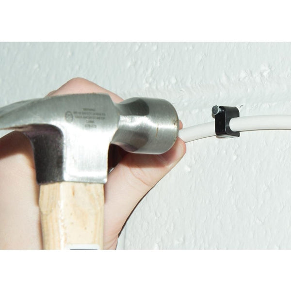 The 1/4 in black polyethylene clip-on coaxial masonry staples 25-pack feature UV-resistant polyethylene saddles that are suitable for indoor and outdoor applications. These staples are ideal for securing RG-59 and RG-6 coaxial cables into cement block and masonry and include hardened nails that can penetrate cement block, mortar or plaster surfaces.