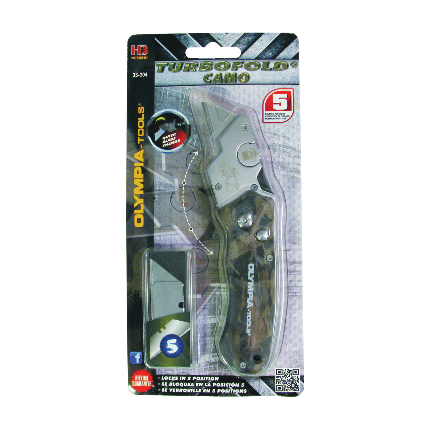 5-position locking, quick blade release dial, easy press lock button and thumb press. Includes five-piece extra blades, belt clip and hang hole in casing tail.