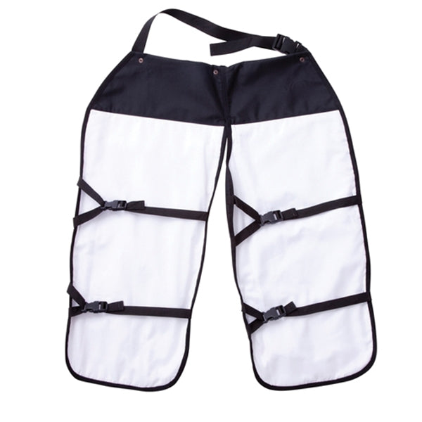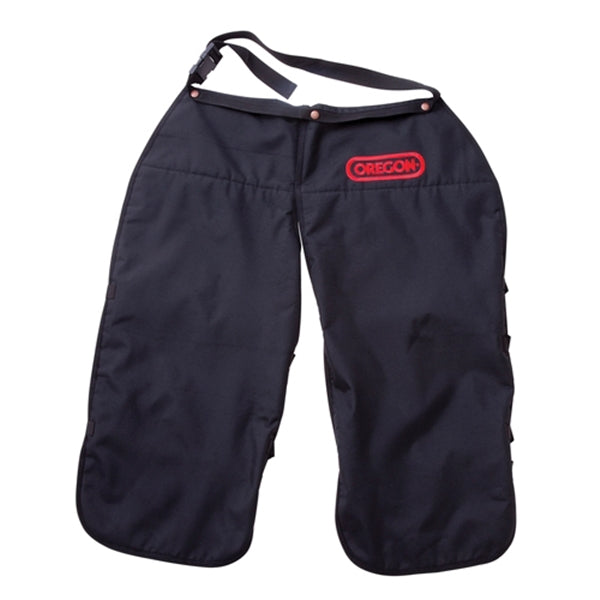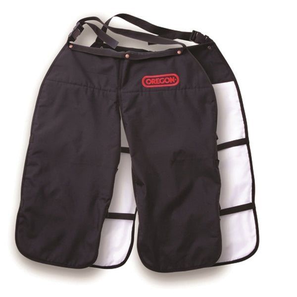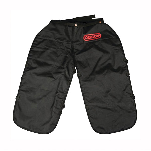 Have 8 layers of breathable warp knit chainsaw protection, they have a 600 Denier Oxford shell, adjustable in the waist up to 46 in, the length is adjustable with top snaps on the waist, 36 in length, UL classified, machine washable. Black color.