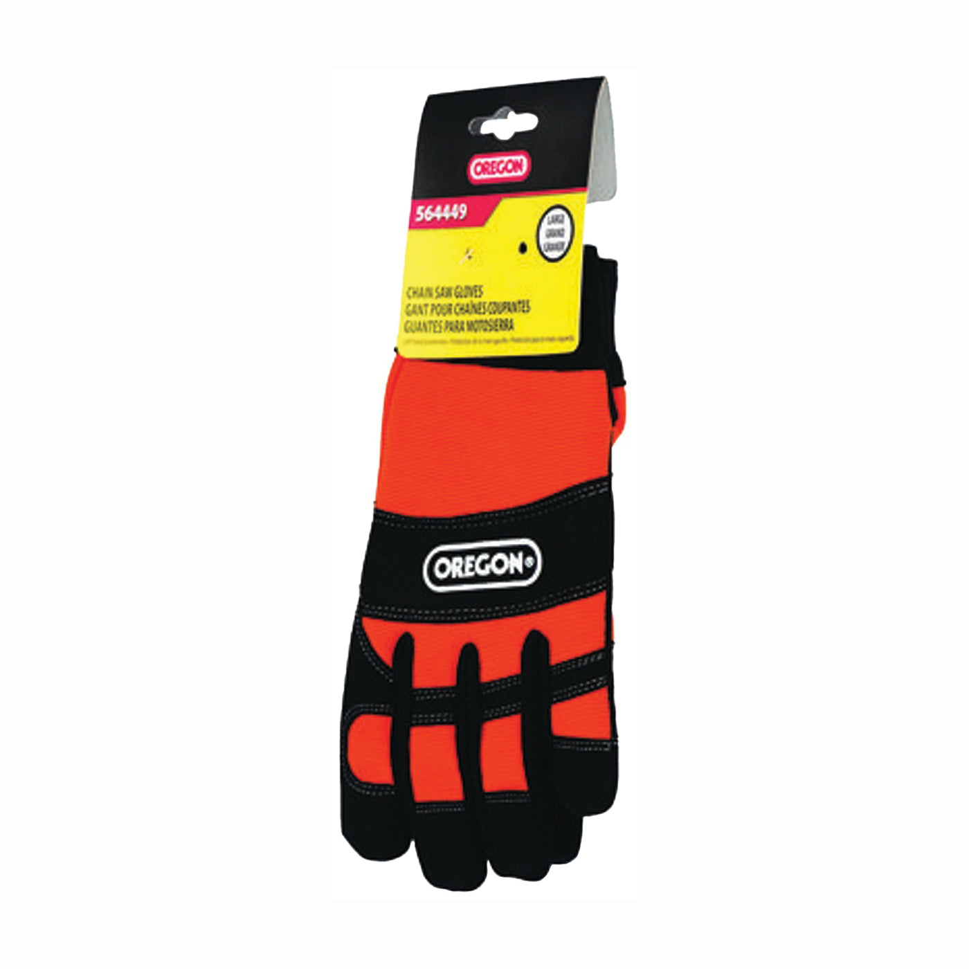 New pro chainsaw gloves with saw protection, shaped and reinforced palm, exposed areas are seamless and reinforced with leather, waterproof kid leather palm and hard wearing, water repellant polyester back, meets requirements of EN 381-4-7, EN 420:1, EN 388, fluorescent back, knitted cuffs. Technical information: saw protection up to 16 m/s, class 0 (only on left), EN381-7 (1999). Large size (noted one-size fits most).