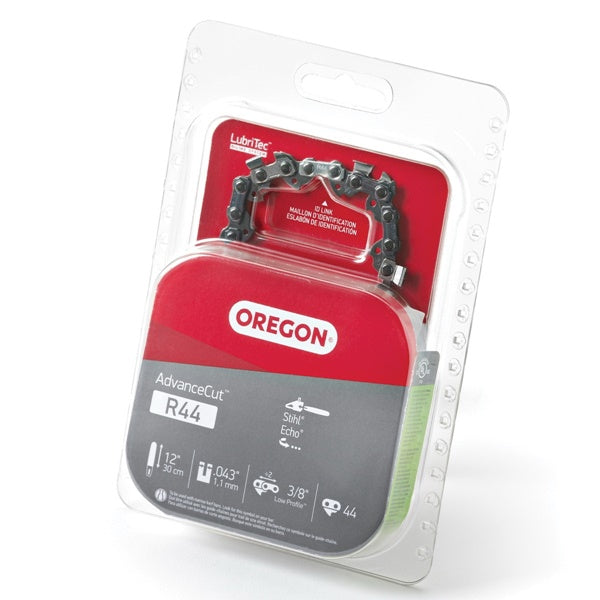 The Oregon R44 AdvanceCut™ saw chain is ideal for landscapers and homeowners using small, low powered saws, because it offers higher chain efficiency. The 0.043 in ga narrow kerf cutting systems increase efficiency since they need less power from the saw than standard cutting systems.