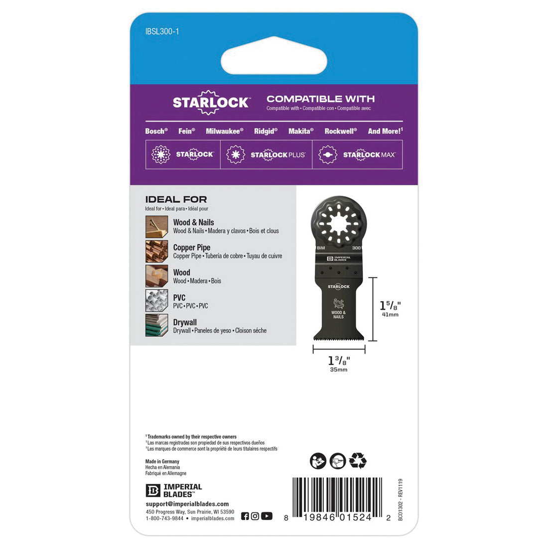Imperial Blades Starlock Standard Blade, 18, Bi-Metal, Applicable Materials: Copper Pipe, Drywall, PVC, Wood and Nails, Black, 1-5/8 in Length, 1-3/8 in Width, Suitable for: Makita, Masterforce, Milwaukee, Performax, Rockwell, Bosch Starlock, Bosch StarlockPlus, Bosch StarlockMax, Fein Multi-Talent Oscillating Tools