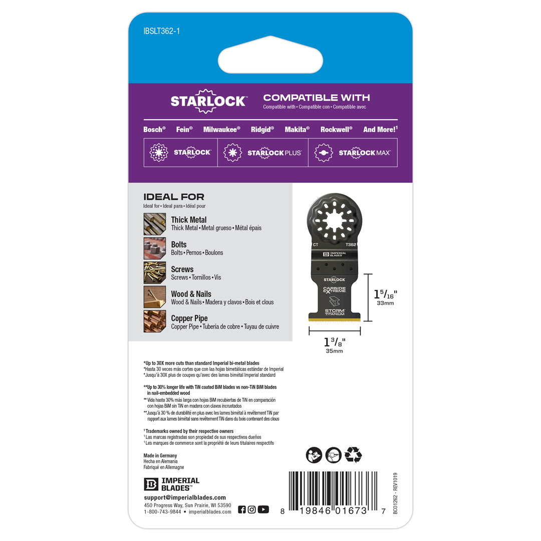 • Imperial Blades Starlock IBSLT362-1 Blade, 1-3/8 in D Cutting, Carbide/Metal/Titanium