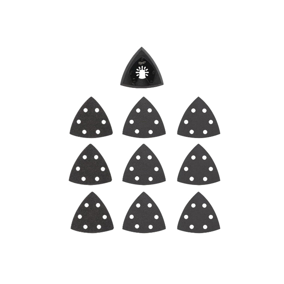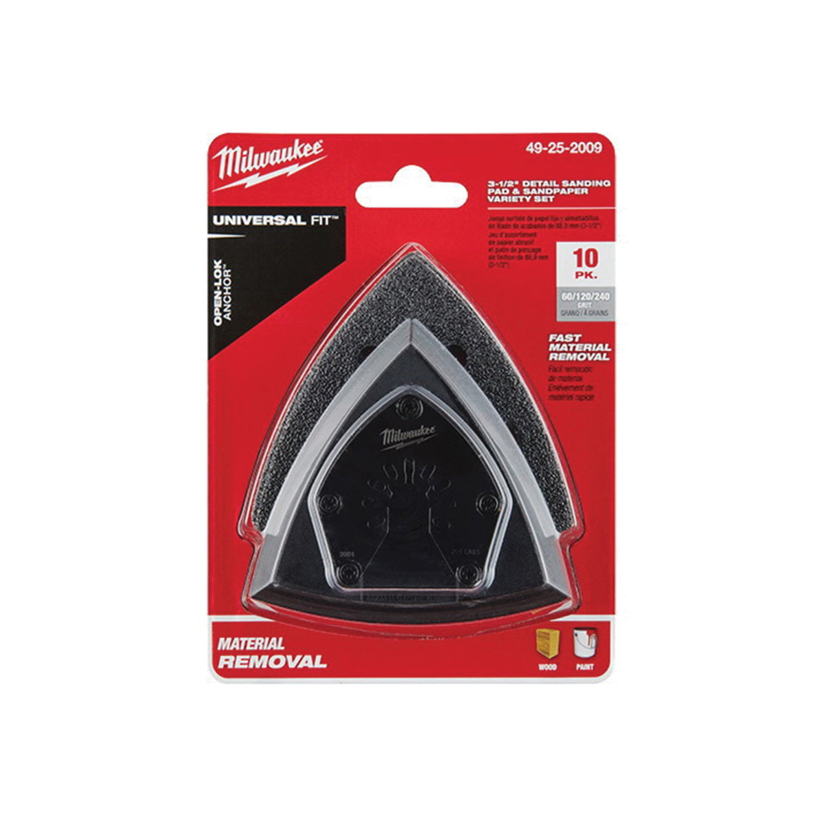 Our universal fit OPEN-LOK™ 3-1/2 in triangle sanding pad and paper 10-piece variety pack is for oscillating multi-tools. The Milwaukee® 3-1/2 in triangle sanding pad and paper variety set utilizes hook and loop technology for fast and secure paper changes. The sanding pad uses a dense foam backer for flexibility and durability, delivering you a longer pad life and a smooth sanding experience. This kit includes 60 grit, 120 grit and 240 grit silicon carbide sandpaper, ideal for paint removal and wood sanding.