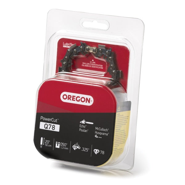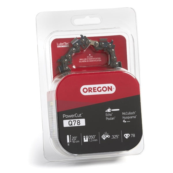 The Oregon Q78 PowerCut™ saw chain is ideal for professional loggers and forest workers using 0.325 in pitch saws. The low-vibration, full chisel cutters cut timber quickly and precisely. Offset depth gauges prevent the cutters from driving into the sidewall of the cut for smoother cuts. This 20 in, 0.050 in ga chain fits chainsaws from several brands including Husqvarna®, Echo®, Jonsered®, Makita® and Poulan®. Check the Fit Guide for a complete list including saws from Echo®, Craftsman®, Homelite®, John Deere, Poulan®, Ryobi® and Remington®.
