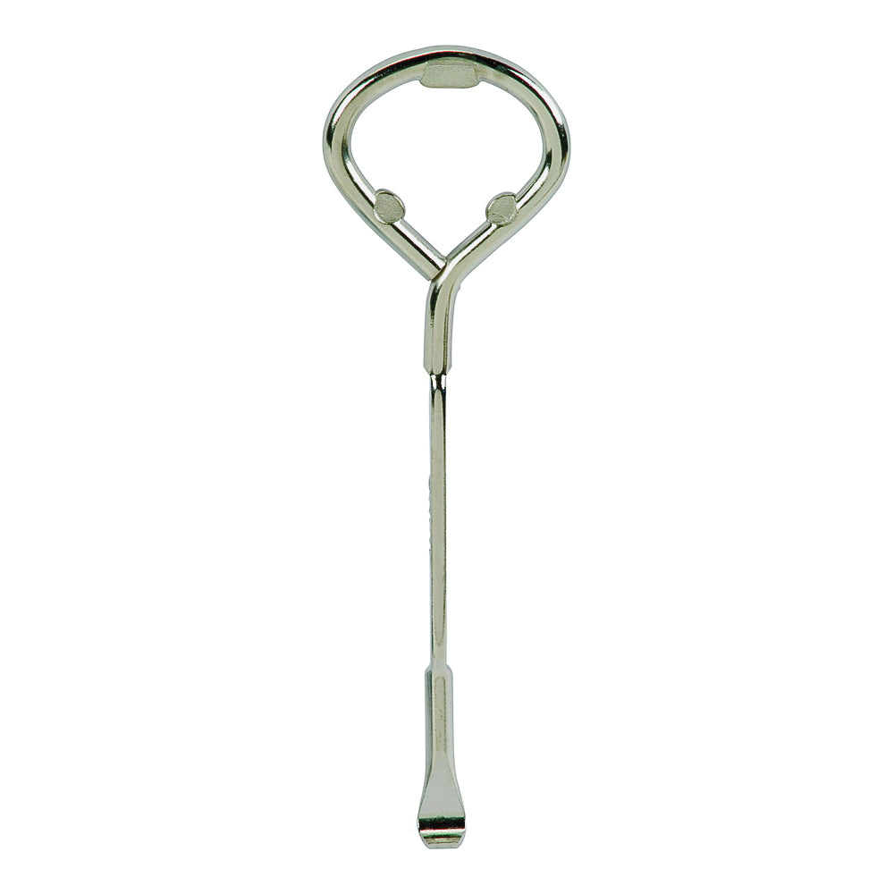 Use to remove paint can lids without damaging seal. Loop style bottle opener. One piece plated steel construction.