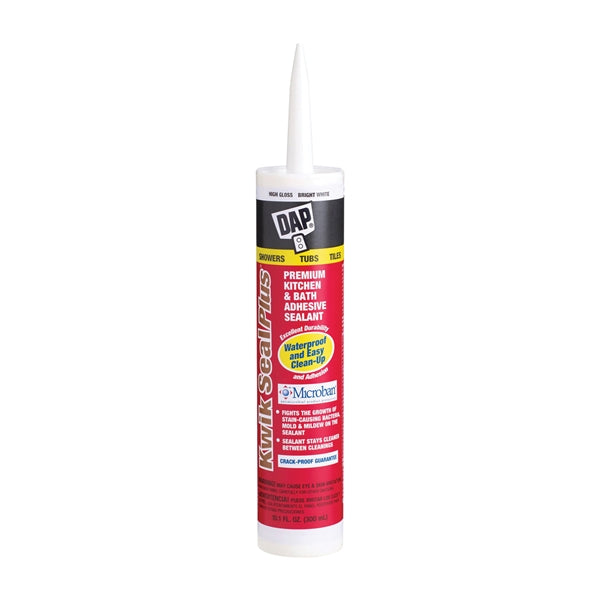 DAP® KWIK SEAL PLUS® kitchen and bath siliconized adhesive sealant contains Microban® antimicrobial product protection to fight the growth of stain and odor-causing bacteria, mold and mildew on the sealant. The advanced Microban® protection neutralizes bacterial and fungal growth where it lives and breads. This means the sealant is easier to keep clean and stays cleaner longer. This specially formulated siliconized adhesive sealant provides excellent adhesion and flexibility for a 100% waterproof and crackproof seal around tubs, sinks, showers, countertops and fixtures. KWIK SEAL PLUS® is easy to apply and tool, paintable, low in odor and cleans up easily with water.