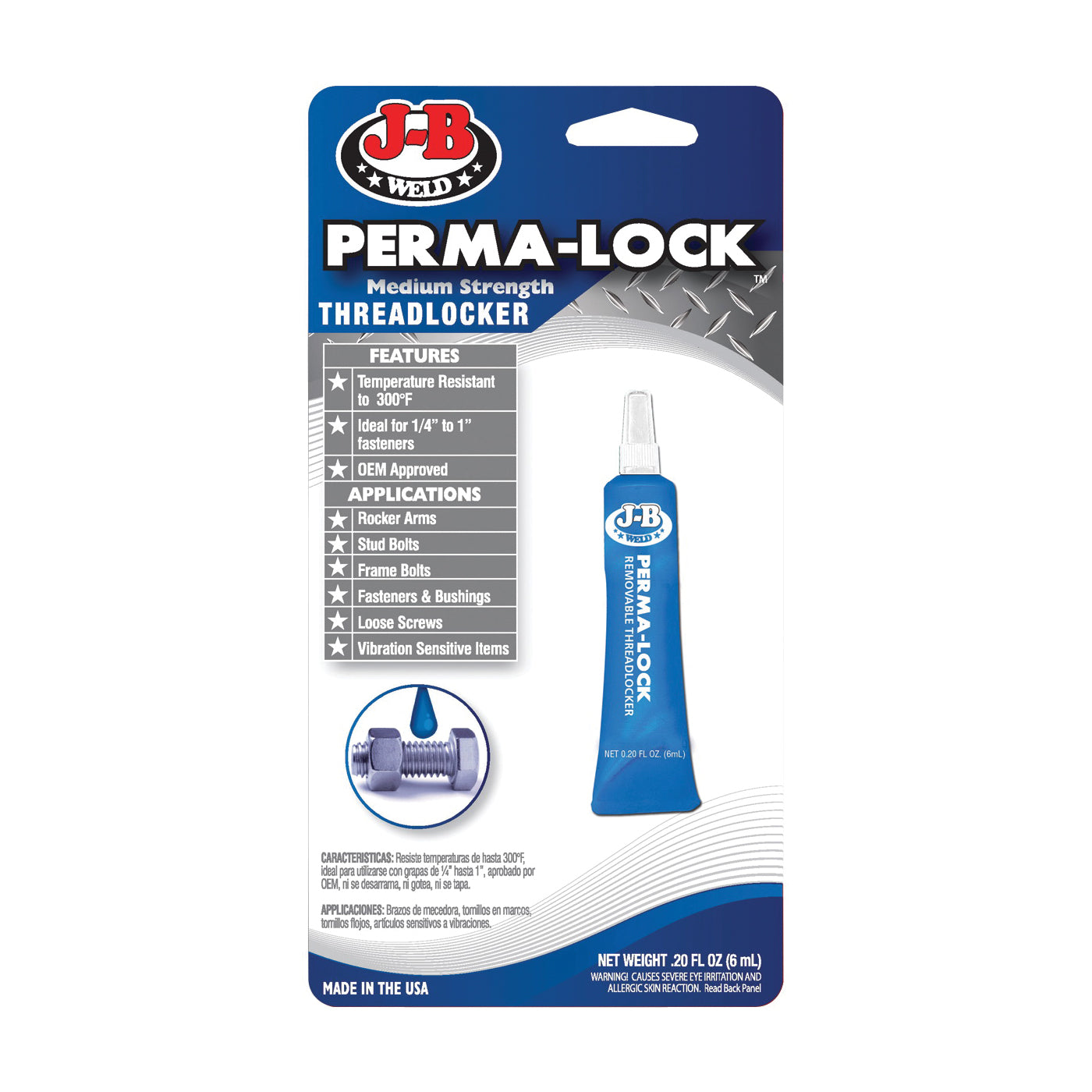 J-B Weld threadlockers provide a reliable and excellent lock and seal for threaded fasteners. Ideal on all mechanical parts, body assemblies and hundreds of other applications to prevent loosening of fasteners from shock and vibration. J-B Weld Perma-Lock medium-strength threadlocker is ideal for fastener applications requiring easy disassembly with hand tools.