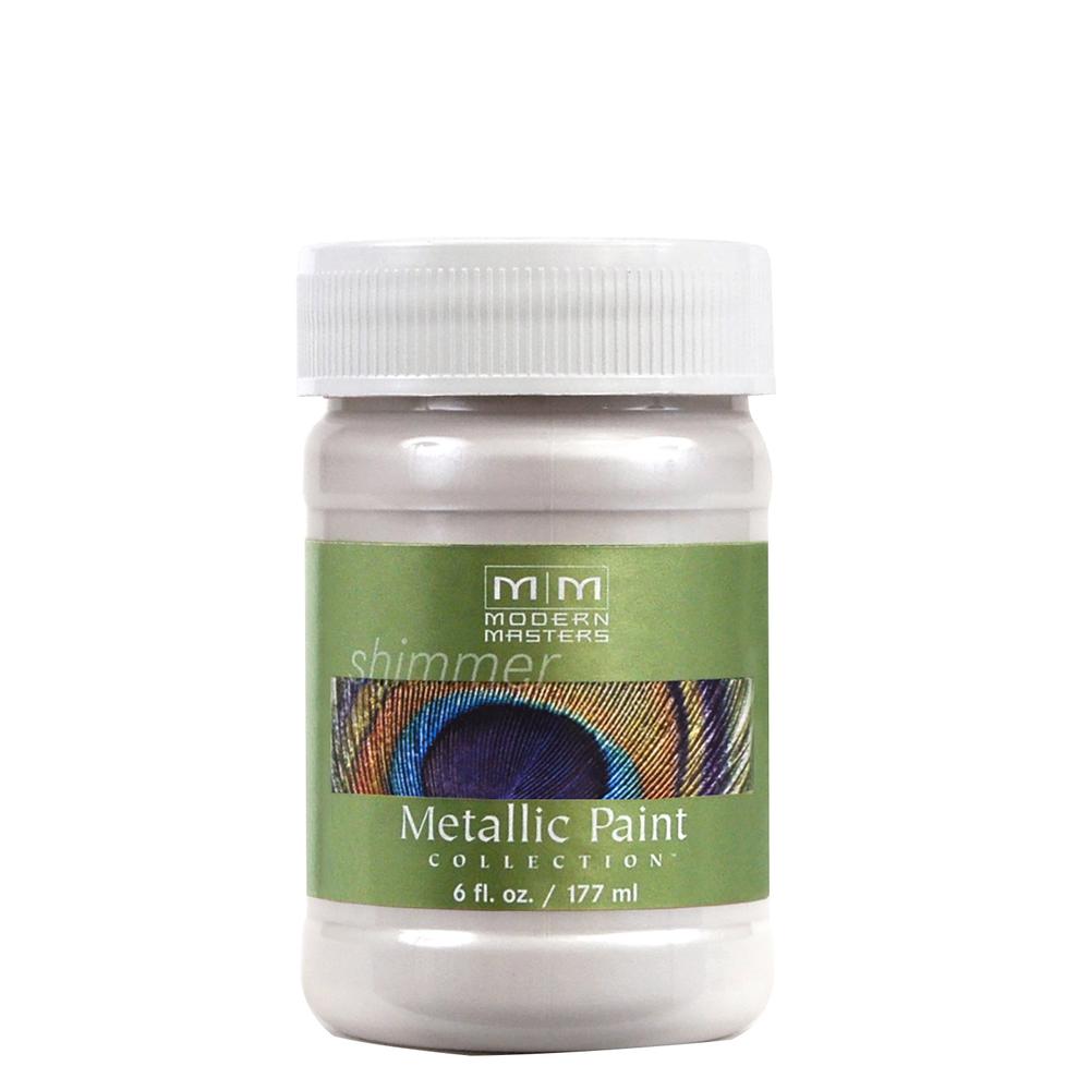 Modern Masters Metallic Paint, Net Content: 6 oz, Oyster, Sheen: Satin, Compositions: Mica, Titanium Dioxide, Vinyl Acetate, Distillates (Petroleum) Solvent-Dewaxed Heavy Paraffinic, Specific Gravity: 1.166, Flash Point: 94 deg C, VOC Content: 99 g/L, pH Range: 5 to 10, Viscosity: 1000 to 25,000 cPs, 320 to 400 sq-ft/gal Coverage Area, Application Method: Brush, Roller, Spray, Applicable Materials: Cast Concrete, Cured Stucco, Galvanized Metal, Masonry and Brick, Unfinished Plywood, Vinyl, Drying Time: 1 hr, Boiling Point: 100 to 5537 deg C, Temperature Rating: 58 to 85 deg F, Flammability Rating: 1, Base Type: Water