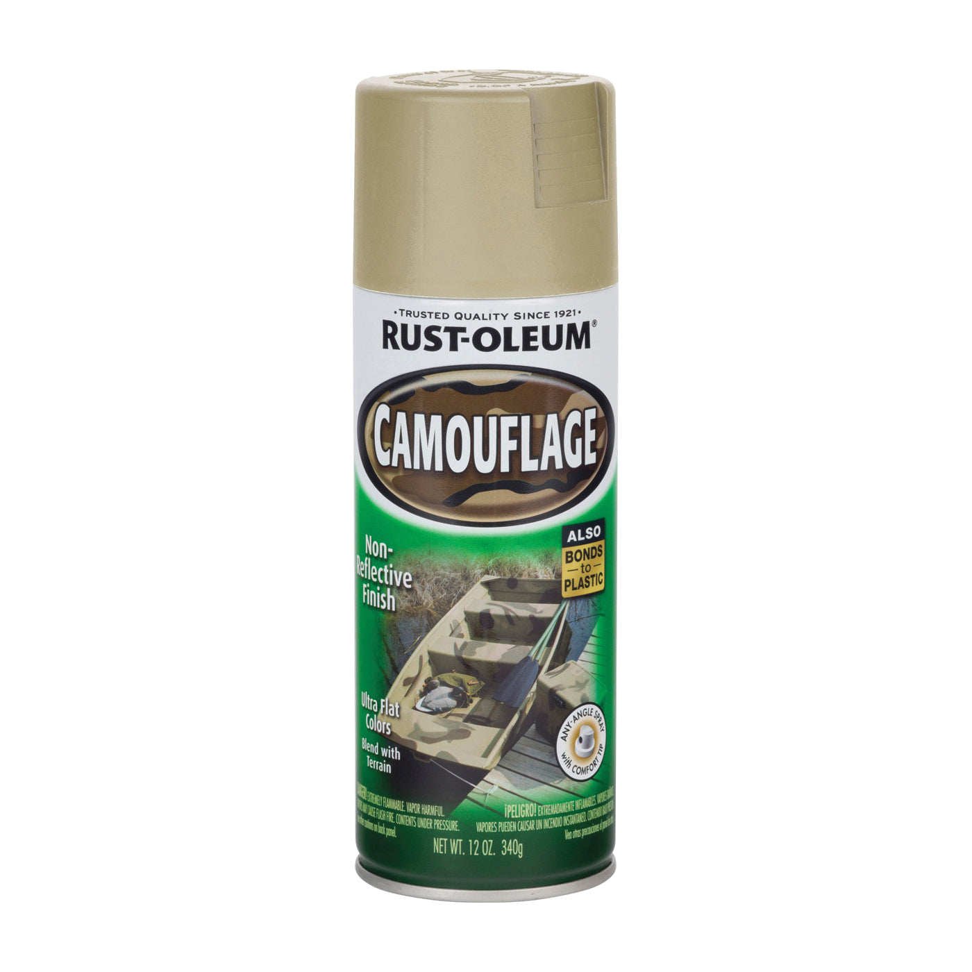 RUST-OLEUM Specialty Camouflage Spray provides a non-reflective, ultra-flat finish for maximum hiding. Applies to metal, wood, plaster or masonry. Offers long-lasting protection when applied on top of primer.