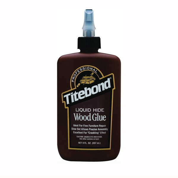 Titebond genuine hide glue is the first hide glue to be offered in a liquid, ready-to-use form. It requires no mixing, heating or stirring. Professional woodworkers use Titebond genuine hide glue for its long assembly time, exceptional strength and unique crackling effect on wood. Titebond genuine hide glue provides superior creep-resistance, offers excellent sandability and is unaffected by finishes. Its sensitivity to moisture allows for easy disassembly of parts, a critical benefit in antique restoration or the repair of musical instruments.