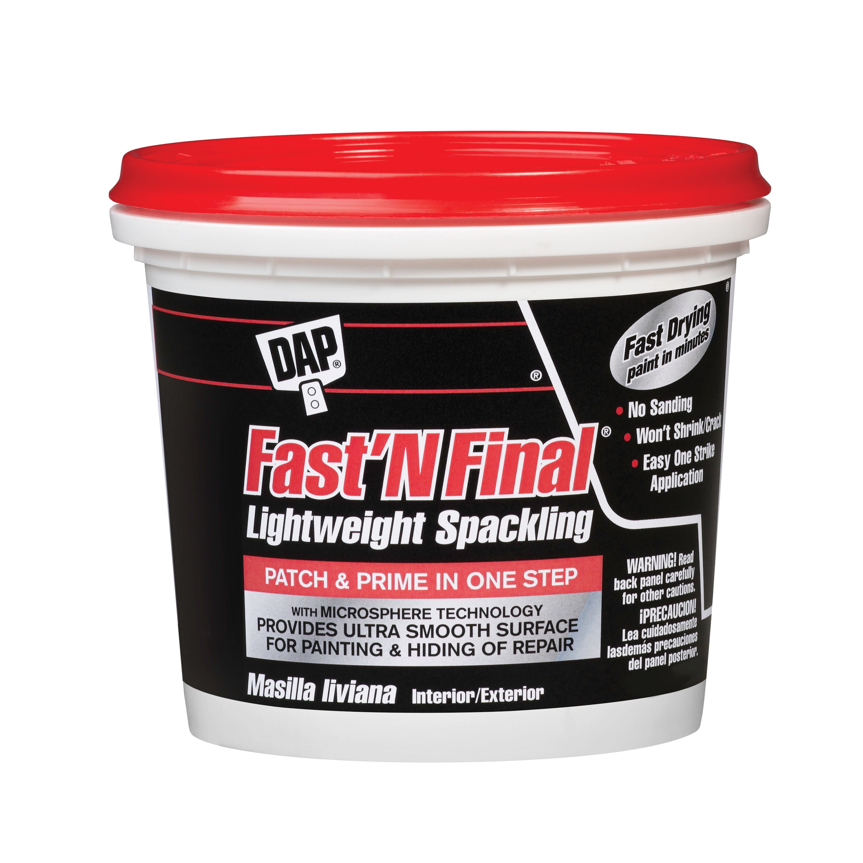 DAP Fast 'N Final lightweight spackling lets you patch and prime in one easy step, saving time and money. It dries fast with no need to sand or prime, letting you paint in minutes. It is easy to apply with one strike of the putty knife. Won't shrink or crack. Ideal for repairing holes, cracks and dents in drywall, plaster, wood and stucco. DAP Fast 'N Final lightweight spackling has a low-VOC content and is low in odor. Interior/exterior use.