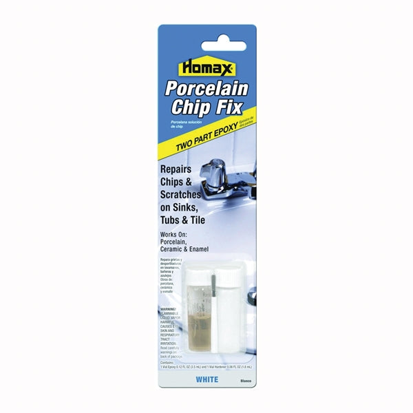 Chips or scratches in your kitchen or bathroom fixtures are unsightly and make a beautiful surface look old and worn-out. Homax® porcelain chip fix repairs the damaged surfaces of your sinks, tubs and tile. The easy-to-use two-part epoxy works on porcelain coated metals, ceramic and enamel surfaces. The self leveling formula produces a high gloss, lustrous, porcelain-like finish. Use Homax® porcelain chip fix to fill and repair unsightly chips and scratches.