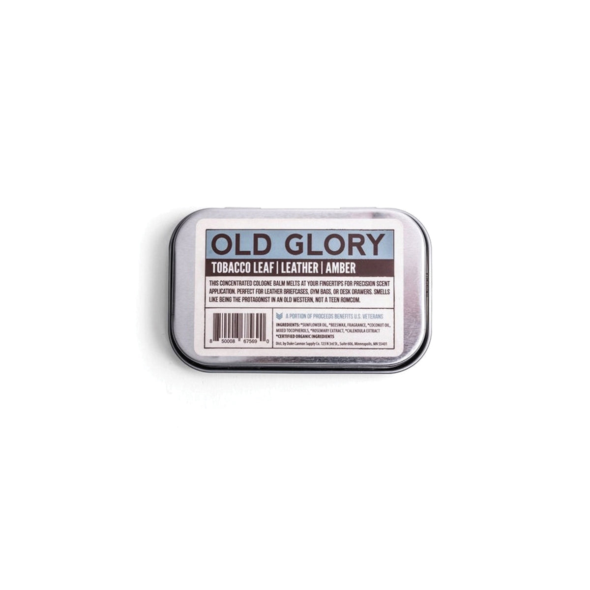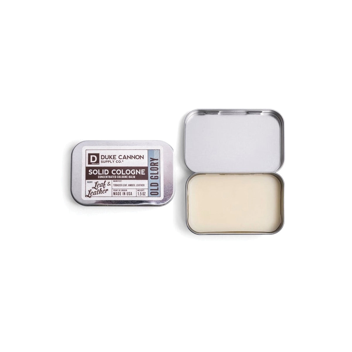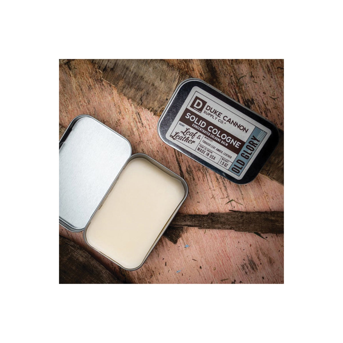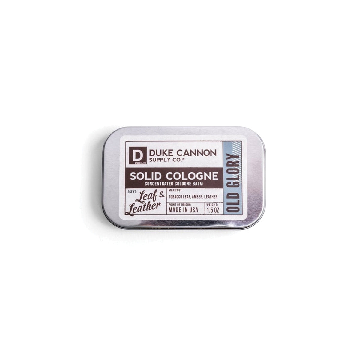 Duke cannon's solid colognes are the alternative to offensive sprays that leave you smelling like you were attacked by the perfume lady at the mall. These portable, concentrated cologne balms melt at your fingertips for the precision application of fragrance on the go. Inspired by our top smelling leaf and leather soap, old glory solid cologne offers a classic and sophisticated essence of fresh rolled tobacco leaves, amber and rich leather. Smells like being the protagonist in a classic western, not an extra in a teen romcom. A 1.5 oz. Tin lasts a good long time even with multiple applications per day.