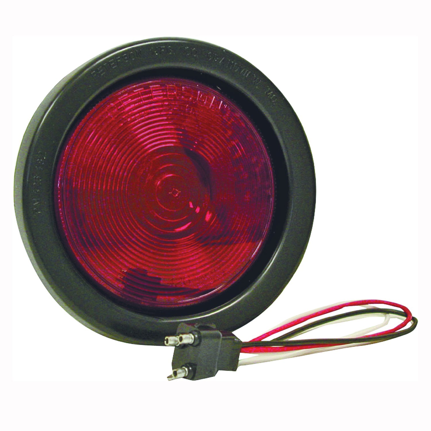Sealed, 4 in round stop, turn and taillight may be used on both curbside and roadside of vehicle or trailer. Fully automated manufacturing process ensures consistent quality and reliability. Features extra wide, spin-welded, tongue-and-groove lens lip and waterproof seal. High performance, copper alloy conductors eliminate the possibility of wire failure. State-of-the art bulb design features three supports for the minor filament and two supports for the major filament providing long bulb life. Wedge-base socket prevents premature bulb failure. Includes light, grommet and 431-491 straight plug. 4-1/4 in Dia.