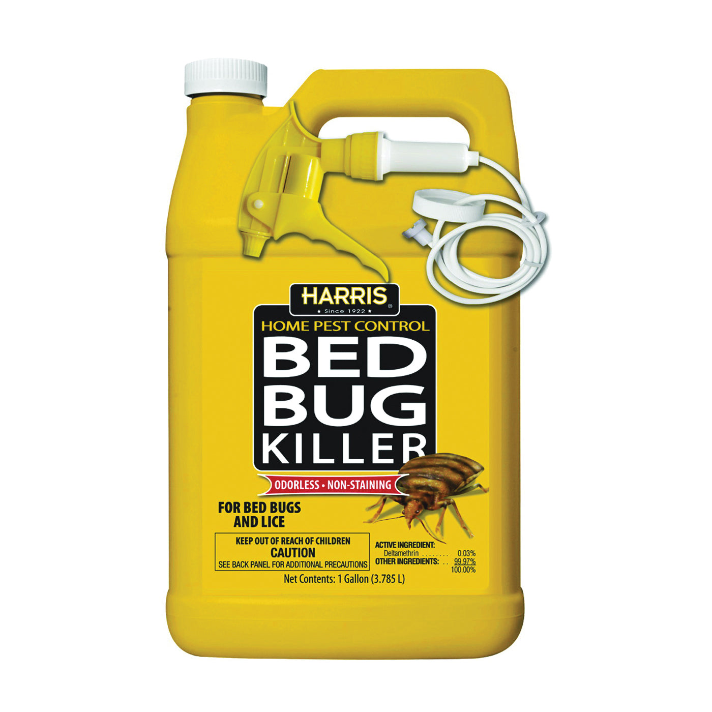 Harris Bedbug Killer 128 oz kills bedbugs and lice and comes with a trigger spray for easy application. We recommend using this product in combination with our bed bug aerosol egg kill on mattresses, box springs, walls, floors and carpets and following up with diatomaceous earth bed bug powder behind electrical outlets around switches where bed bugs tend to congregate. The odorless, non-staining formula kills bed bugs after the spray dries.
