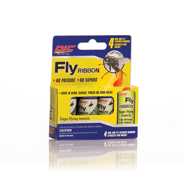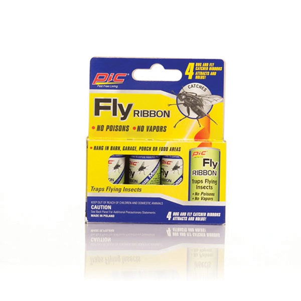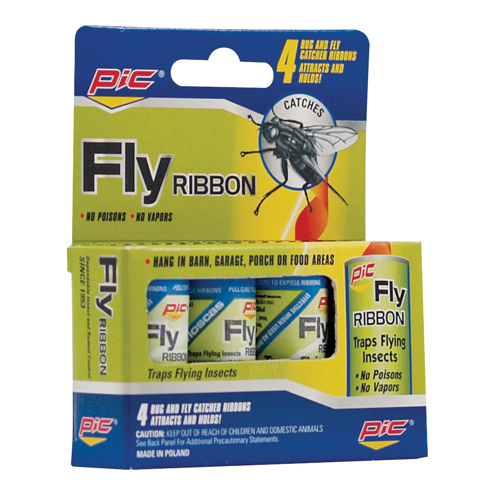 Pic® fly ribbon catches flies indoors or outdoors. Easy-to-use warm tube in hands to facilitate removal of the ribbon. Remove the thumbtack and carefully set aside. Hold the red loop and pull down the tube slowly with a twirling motion until the ribbon is fully exposed. Hang the ribbon by placing the thumbtack through the red loop and place anywhere flies are a nuisance.