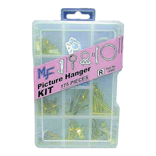Durable and reusable container with assorted kinds and sizes of picture hangers, wire and nails. Contains enough items to complete multiple projects.