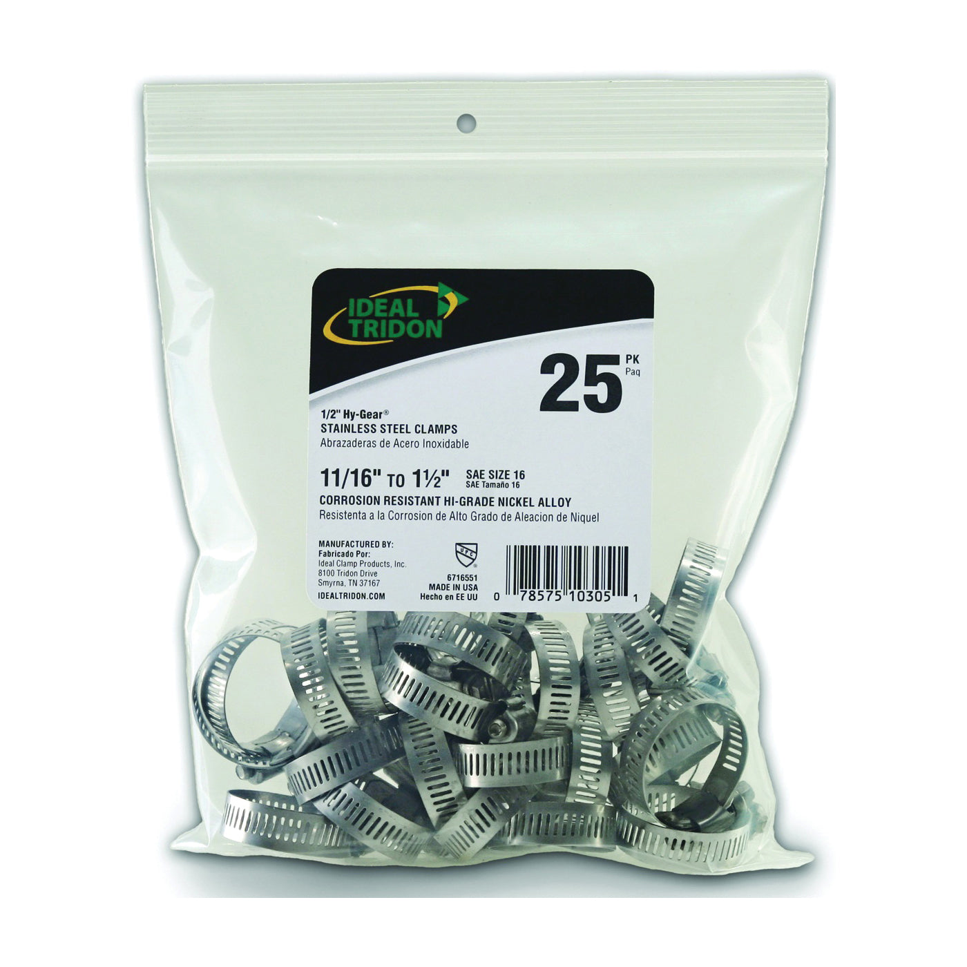 Ideal-Tridon Hy-Gear 67-6 Worm Gear Hose Clamp, Nominal Opening Size: 11/16 to 1-1/2 in, Hex Bolt Size: 5/16 in, Trade Size: #16, 316 Grade, 1/2 in W, Bolt Material: Stainless Steel, Stainless Steel