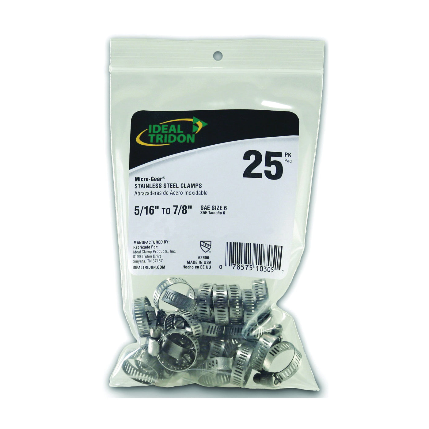 Ideal-Tridon Micro-Gear 62M Worm Gear Hose Clamp, Nominal Opening Size: 5/16 to 7/8 in, Hex Bolt Size: 1/4 in, Trade Size: #6, 300 Grade, 5/16 in W, Bolt Material: Stainless Steel, Stainless Steel