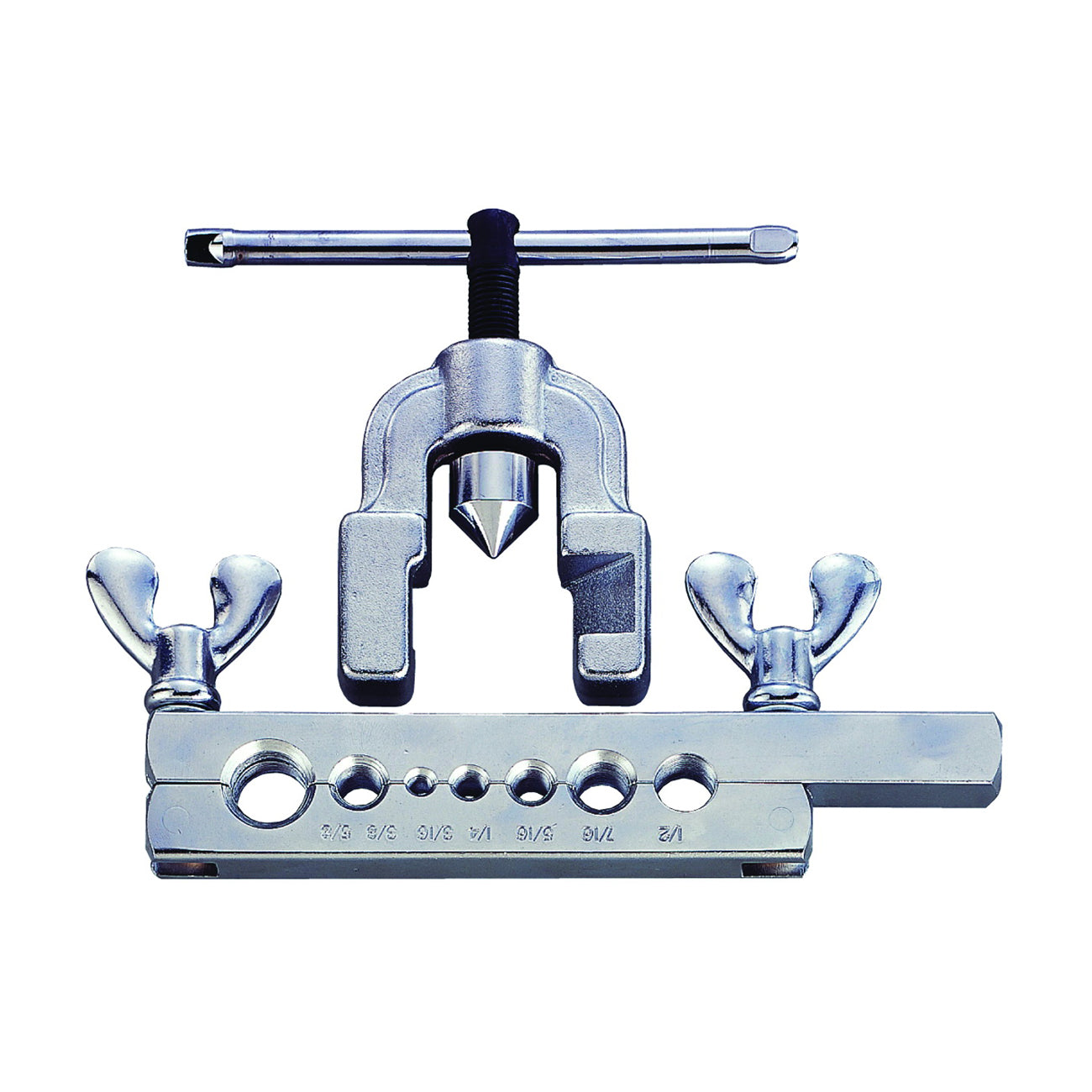 This flaring tool is faceted and made of hardened steel with a chrome finish. It automatically burnishes flare face reducing the need for deburring. The original wall thickness is maintained at base of flare. The larger handle, with better leverage, and precision threads on feed screw make flaring effortless. Has heat treated dies grip tubing without scoring and satin chrome and black finish.