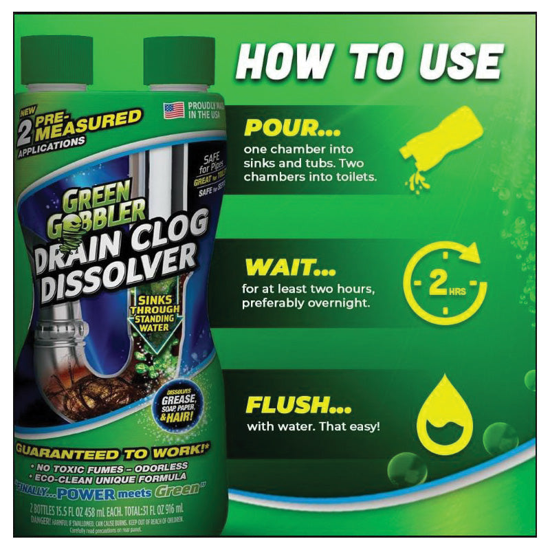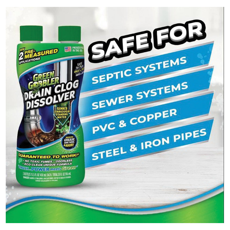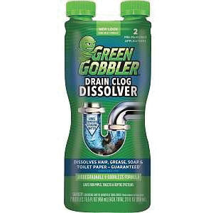 Our liquid hair clog remover will break down the hair that's stuck in your bathroom drain. It liquefies oils and soap scum, too. Clearing a clog has never been easier. Dissolve is a fast-acting hair clog remover from Green Gobbler. Our high density formula sticks to pipe walls to liquefy drain obstructions caused by hair, oils, fats, sludge, paper products and other organic material.