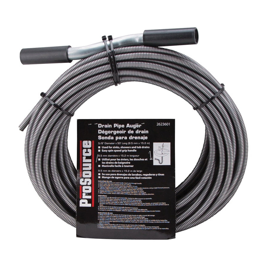This drain augur is for small household drains. It's made of high carbon, oil tempered, non-kink, flat 1/4 in steel wire and has a closed wound spring boring head. The drum has a steel rod frame holder for easy storage and use.