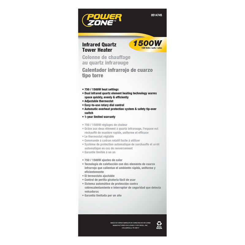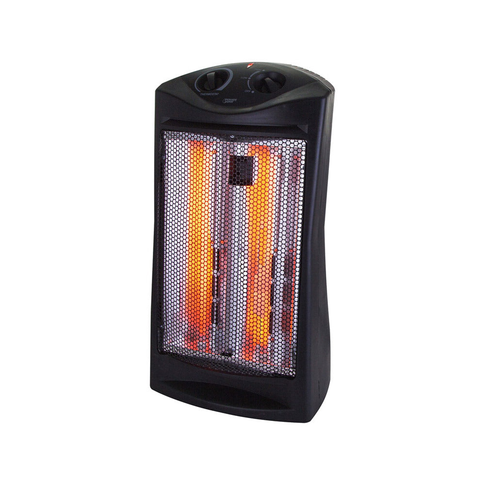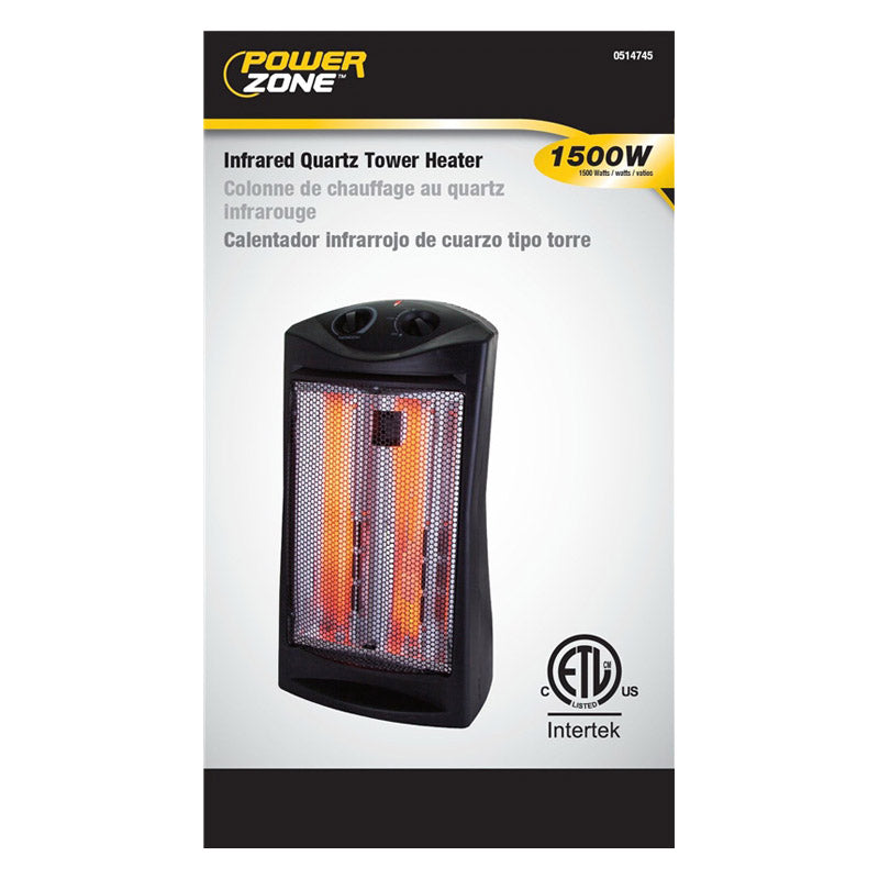 Infrared Quartz Tower Heater, 750/1500 W heat settings. Dual infrared quartz element heating technology warms space quickly, evenly and efficiently. Adjustable thermostat. Easy-to-use rotary dial control. Automatic overheat protection system and safety tip-over switch.