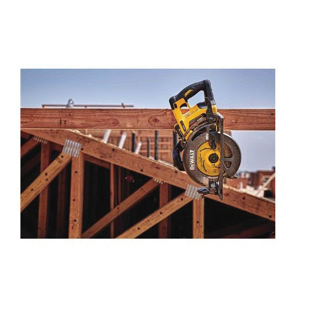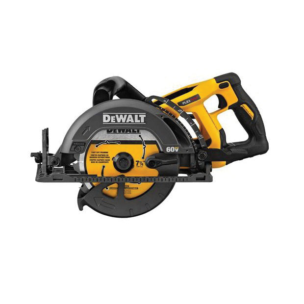 The FLEXVOLT 60 V maximum 7-1/4 in cordless worm drive style saw features a blade oriented to the left of the motor and the handle positioned at the rear of the saw to optimize line of sight when cutting. An electronic brake helps stop the blade after the trigger is released. Bevel capacity is 53 deg with stops at 45 deg and 22.5 deg. The saw achieves smooth, accurate cuts and long runtime with a durable, high-grade magnesium shoe and an efficient brushless motor. This cordless worm drive style saw achieves 2 to 7/16 in depth of cut at 90 deg. Hang the tool conveniently with the included rafter hook. This tool is also Tool Connect Tag-Ready™ so you can easily track it by attaching a Tool Connect™ Tag. It's ideal for use in a variety of wood cutting applications such as oriented strand board, plywood, hardwoods, dimensional lumber and flooring. Many of the professional contractors using this tool include framers, concrete formers, carpenters and general contractors.
