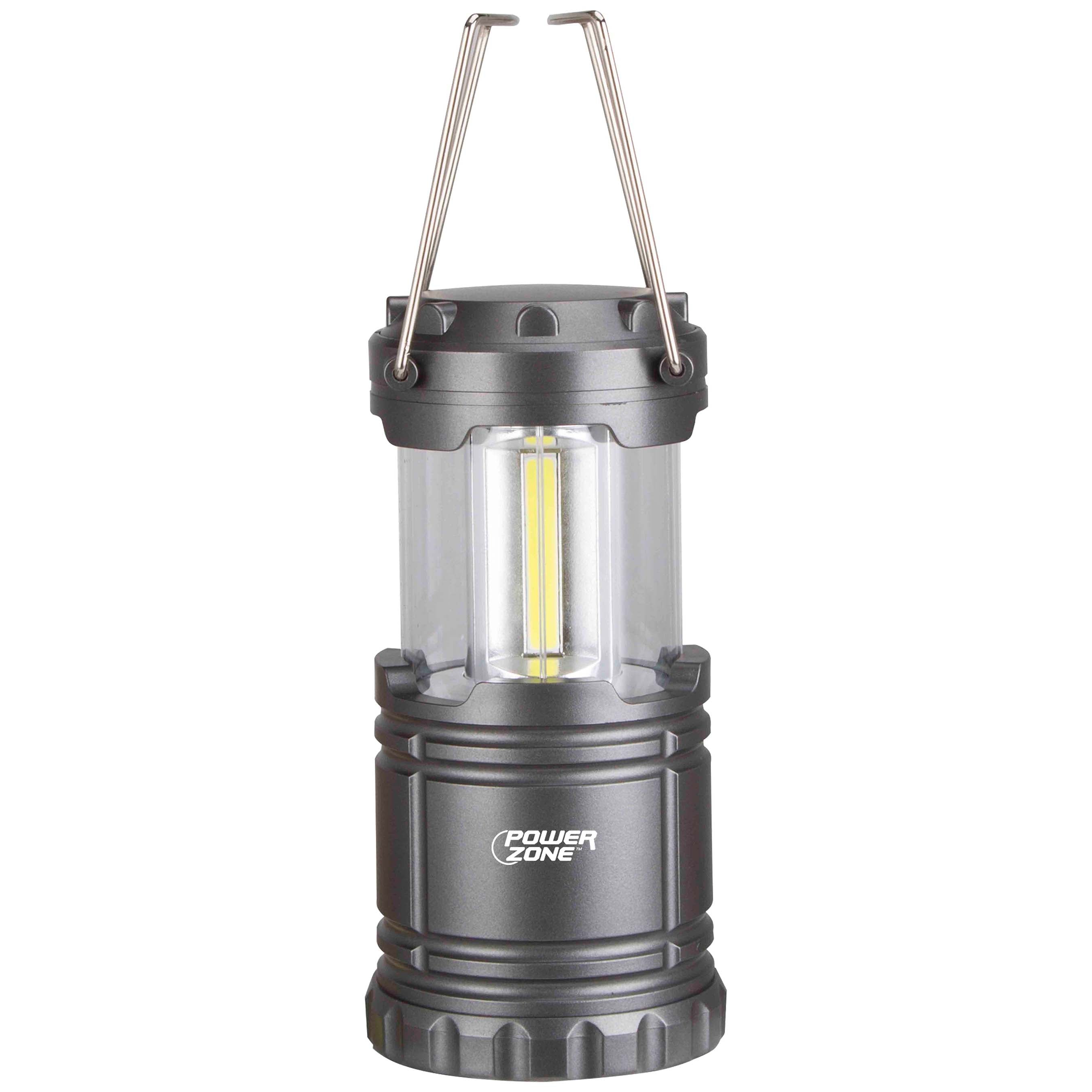 COB LED collapsible camping lantern with 250 lumens. Plastic construction housing with carrying handle. Lightweight, compact size and collapsible for easy storage & carrying. Powered by 3 AA batteries included.