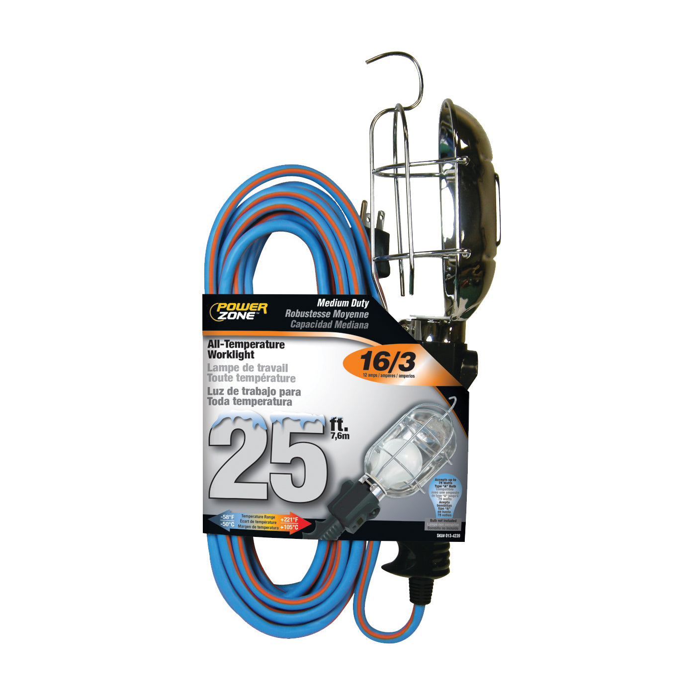 This PowerZone work light has a metal bulb guard with a hook for hands-free use and a 25 ft oil-resistant power cord that's ideal for workshops automotive garages and more! It also has a grounded outlet in the handle from which you can power another tool or appliance rated up to 12 amps. The standard Edison socket makes this work light compatible with LED CFL and standard incandescent light bulbs.
