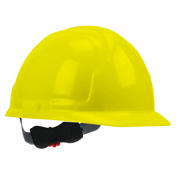 Safety Works Hard Hat, Suspension Type: 4-Point Textile, Shell Material: HDPE, Yellow, Fits Hat Size: 6-1/2 to 8 in, Adjustment Type: Wheel Ratchet, Class: E