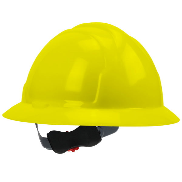 Safety Works Hard Hat, Suspension Type: 4-Point Textile, Shell Material: HDPE, Yellow, Fits Hat Size: 6-1/2 to 8 in, Adjustment Type: Wheel Ratchet, Class: E, Resists: UV Rays