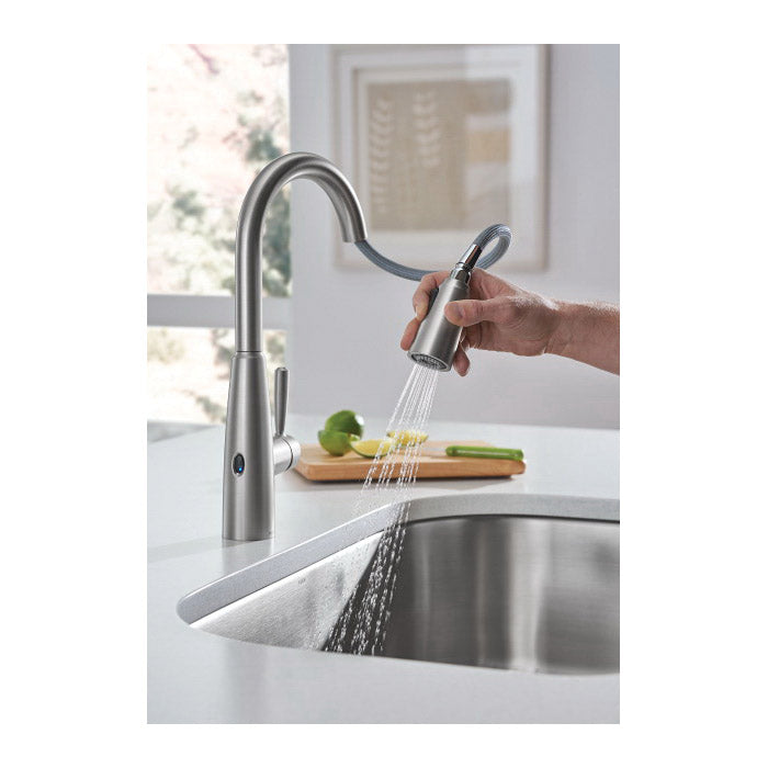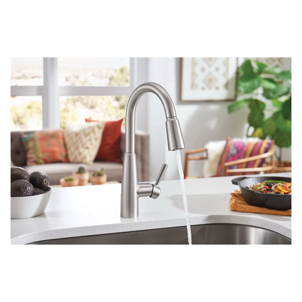 Moen Sperry Motion Pull-Down Kitchen Faucet, 3/8 in Connection, Compression Connection, 1.5 gpm, 60 psi, Deck Plate Size: 2-1/2 in, Spout Type: High Arc, Spout Reach: 7.84 in, Spout Height: 15.86 in, Lever Handle, Number of Faucet Handles: 1, Metal, Stainless Steel, Deck Mounting, Number of Faucet Holes: 2, Faucet Hole Size: 1-1/2 in, Dimensions: 15-3/8 in H