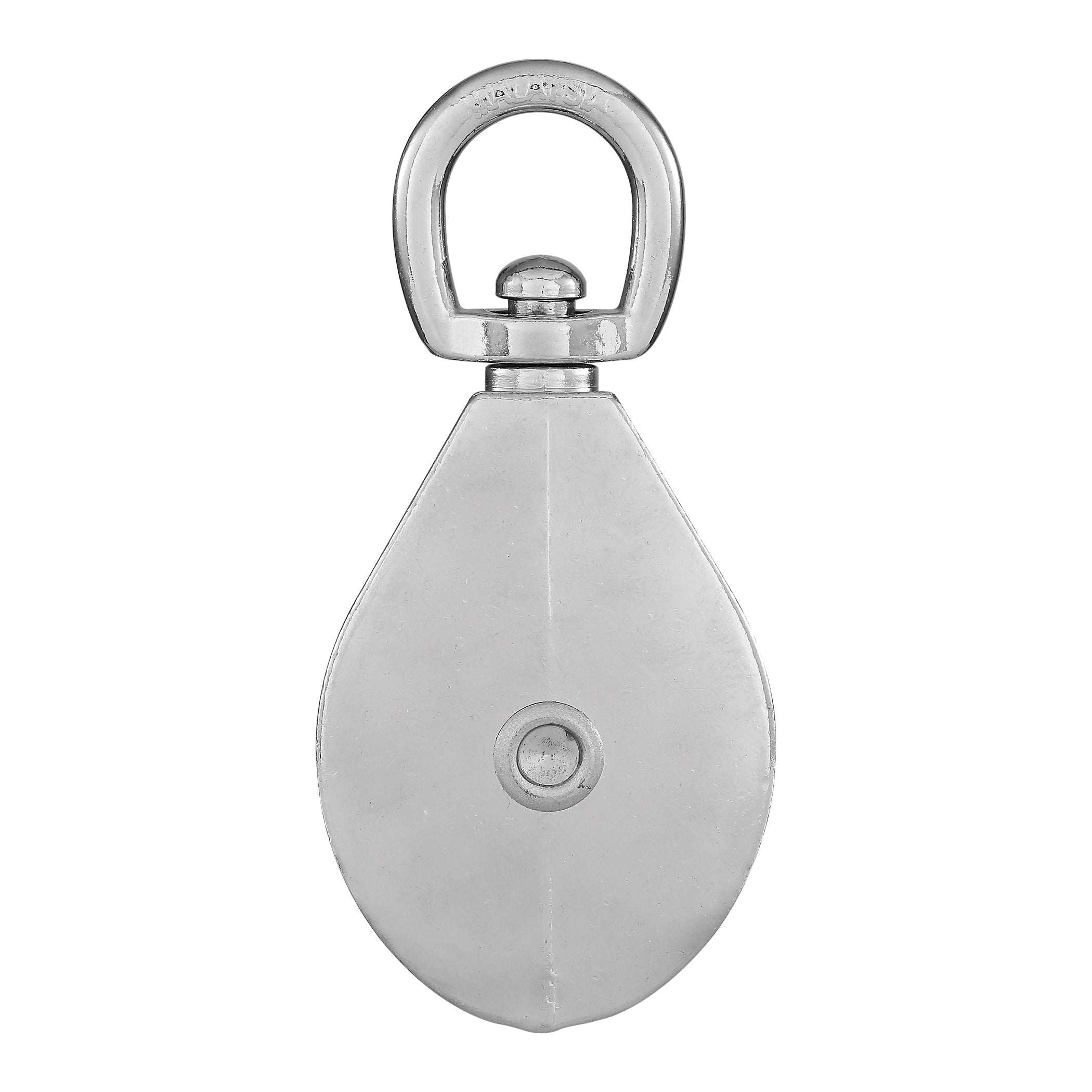 National Hardware Pulley, Single, Working Load Limit: 55 lb, Attachment Type: Swivel Eye, Eye Diameter: 25/32 in, Frame Size: 2-3/4 in H x 1-31/32 in W x 29/32 in D, Rope Size: 1/2 in, Sheave Size: 1/2 in L x 1-15/16 in H, Sheave Material: Brass, Block Material: Zinc, Nickel, 4-5/32 in OAL, 1-31/32 in OAW