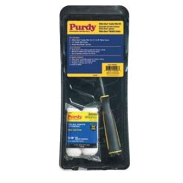Purdy Jumbo Mini Paint Roller Kit, Specifications: 3/8 in Nap, 4-1/2 in Roller, Plastic, 4 Piece, Includes: (1) Heavy-Duty Plastic 1 qt Tray, (1) 12 in Jumbo Mini Roller Frame, (2) 4-1/2 in Whitedove Roller Cover