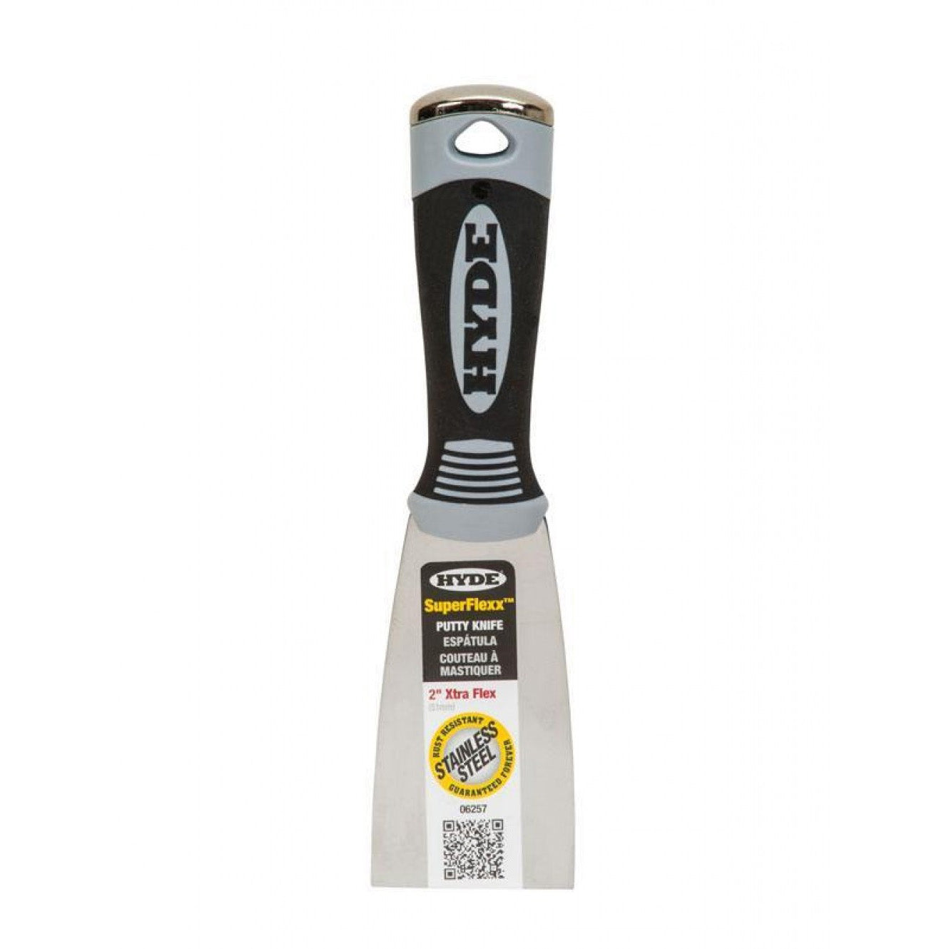 2 in flexible blade for applying compounds, smoothing and taping. Get the flexibility you need without the rusting or knicking. Constructed with 54 Rockewell C hardness. Superior grip has overmold cushioning. Rivet-free construction complete with a Hammer Head® end.