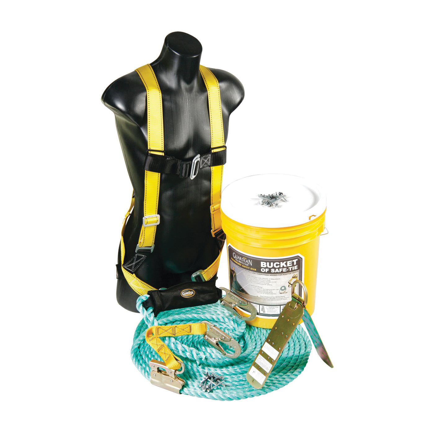 The bucket of safe-tie is a roofing kit built for the roofer, by the roofer. It is one of the few kits available on the market that includes a lifeline with an integrated shock absorber, which allows the worker to never have to worry about incorporating an additional shock absorbing lanyard into their fall protection system. Removing the shock absorbing component from the worker's back also results in less weight placed on the dorsal D-ring, resulting in an increase in comfort level and ease of movement. The bucket of safe-tie comes in a variety of configurations and can be customized for specific customer needs.