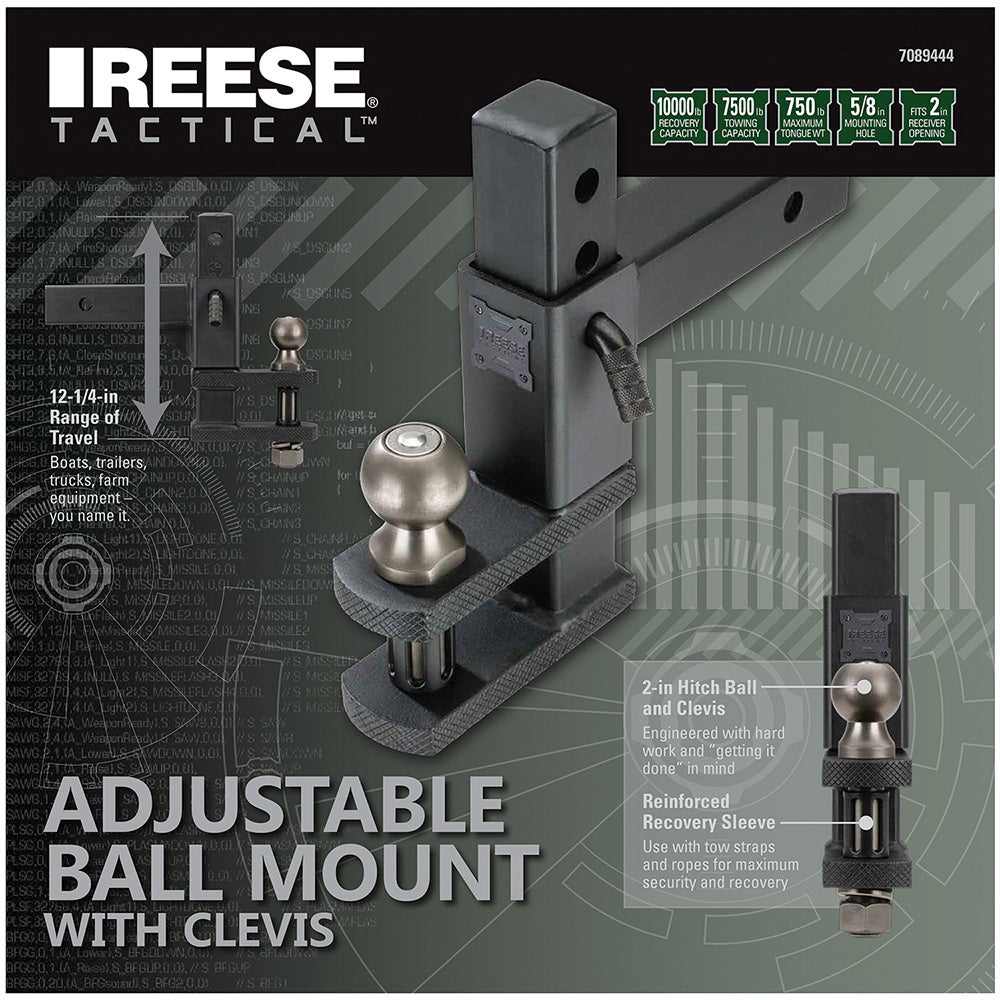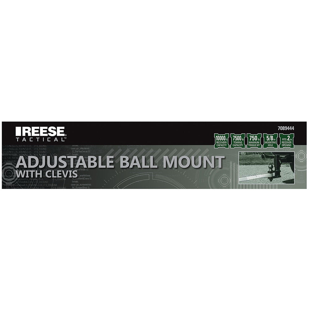 The REESE Tactical Adjustable Ball Mount with Clevis allows you to tow what you need to and recover what you have to. The patented design provides greater towing capacity and safe recovery solutions all within a range of 13 in of total adjustability. In addition, a 2 in hitch ball and clevis comes equipped with a reinforced cast steel recovery sleeve. Use this with tow straps for extra security when towing and vehicle recovery. The unique design of the hitch ball and clevis allows you to swap out a 2 in ball for a 2-5/16 in ball (P/N 7090100). Rugged knurled textures, matte black and pewter finishes and unique hitch ball design makes this adjustable ball mount the best looking and tactical product on the market. The Adjustable Ball Mount with Clevis is designed to pull 7500 of towing capacity and to fit 2 in receivers. As with all REESE Tactical products, strength, versatility and style is the new standard. Engineered to be different. Engineered to be better.