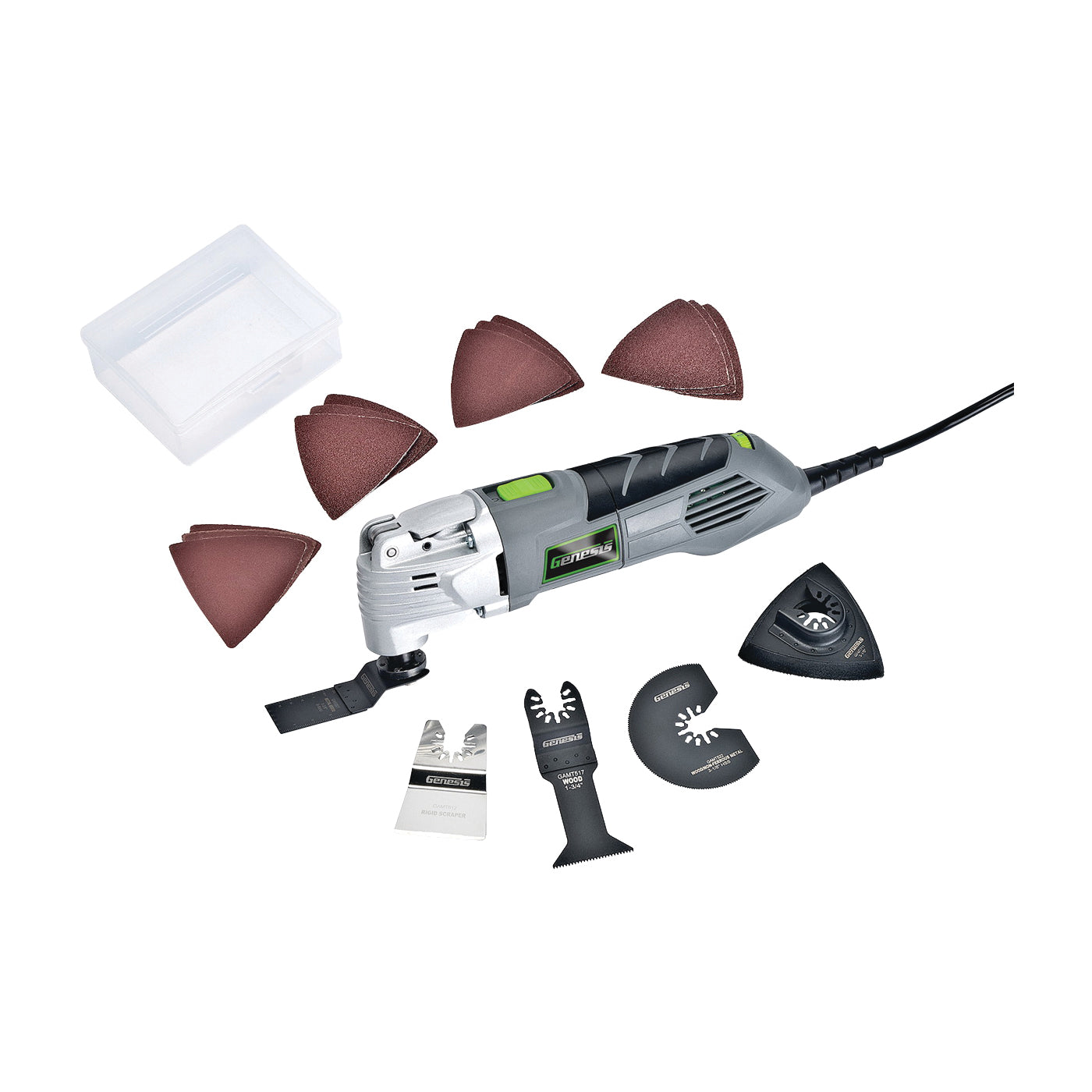 For home repair, remodeling and restoration. Use as a detail sander, flush and plunge cut saw, drywall cut-out tool, power scraper, grout removal tool and more. Tool-free quick-change accessory system. Powerful 2.5 A motor. Variable speed (15,000 to 22,000 opm) for versatility. 6-pin flange design holds accessories firmly in place. Weighs only 3.2 lb. Die-cast aluminum gear housing. Includes 3 in delta sanding pad, 12 sanding triangles, rigid scraper blade, 1-3/8 in (35 mm) bi-metal flush cut blade, HSS segmented saw blade, 1-3/4 in coarse tooth flush cut blade and accessory storage box.