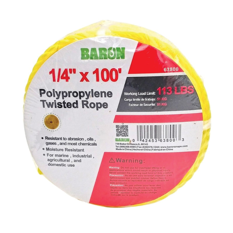 Baron Rope, Working Load Limit: 113 lb, Rope Construction: Twisted, Polypropylene, Yellow, 1/4 in Dia, 100 ft L