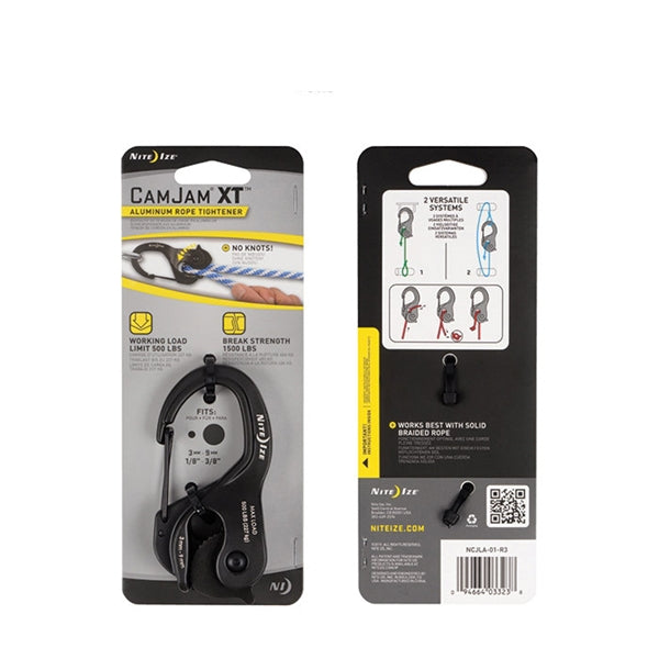 The CamJam XT aluminum rope and cord tighteners feature Nite Ize signature, knot-free CamJam tightening and tensioning technology. Available in two heavy-duty sizes and built from durable, cast aluminum, this rugged combination of carabiner and cam mechanism is designed to tighten, tension, connect and secure serious loads up to 280 and 500 lb respectively. The CamJam XT products feature a carabiner clip and gate on one end and a rotating cam mechanism on the other. This clever design allows the CamJam XT to be configured in either a fixed end or a loop system to securely tie down lumber, gear and other heavy loads. In both systems, the CamJam XT can be easily adjusted and re-adjusted time and again to tackle a multitude of tie-down projects over the years. The XT holds cord from 1/16 to 3/16 in W and the XT large holds rope with a diameter of 1/8 to 3/8 in.