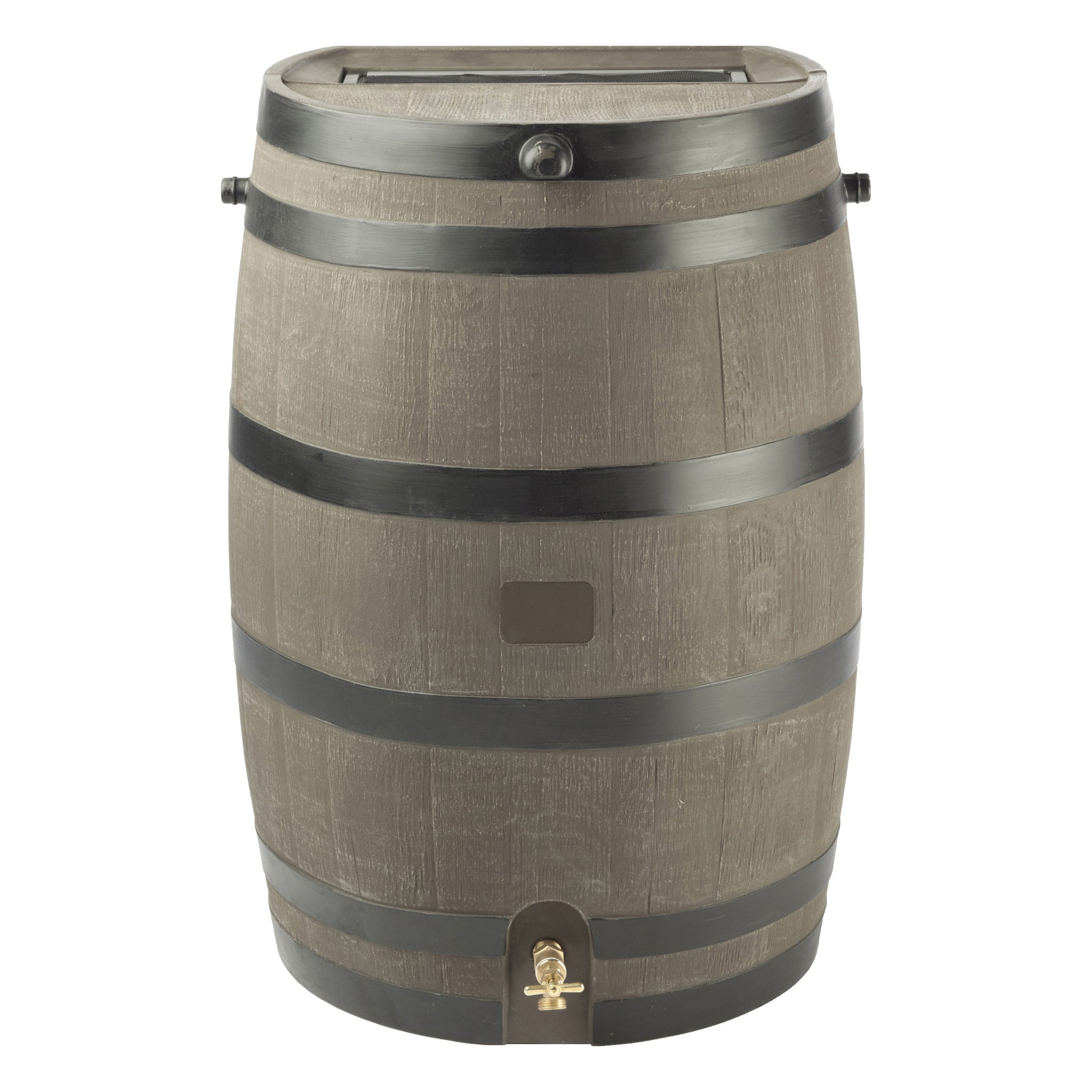 Authentic wood grain barrel texture is molded into each barrel and will not fade, rot or risk insect infestation. Unique feature includes a flat back to sit flush against a wall. Linkable to other rain barrels for increased water collection. Screen to keep out debris and insects and a shut-off valve for hose hook-up with dual overflow. Dimension of 24 in L x 19 in W x 34 in H.