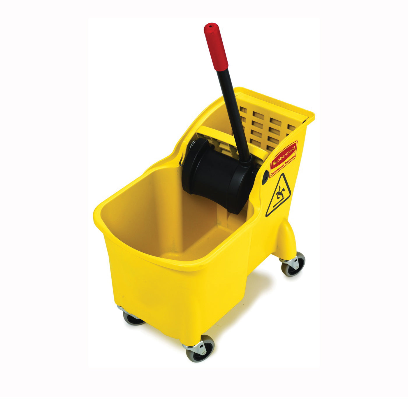 All-in-one compact design. One-piece design: integrated bucket and wringer. Holes in both wringing plates force more water from mop in less time. Reverse-wringing mechanism for more comfortable use. Built-in lift handles on bottom of bucket make lifting and emptying easier. Accepts up to 24 oz mops.