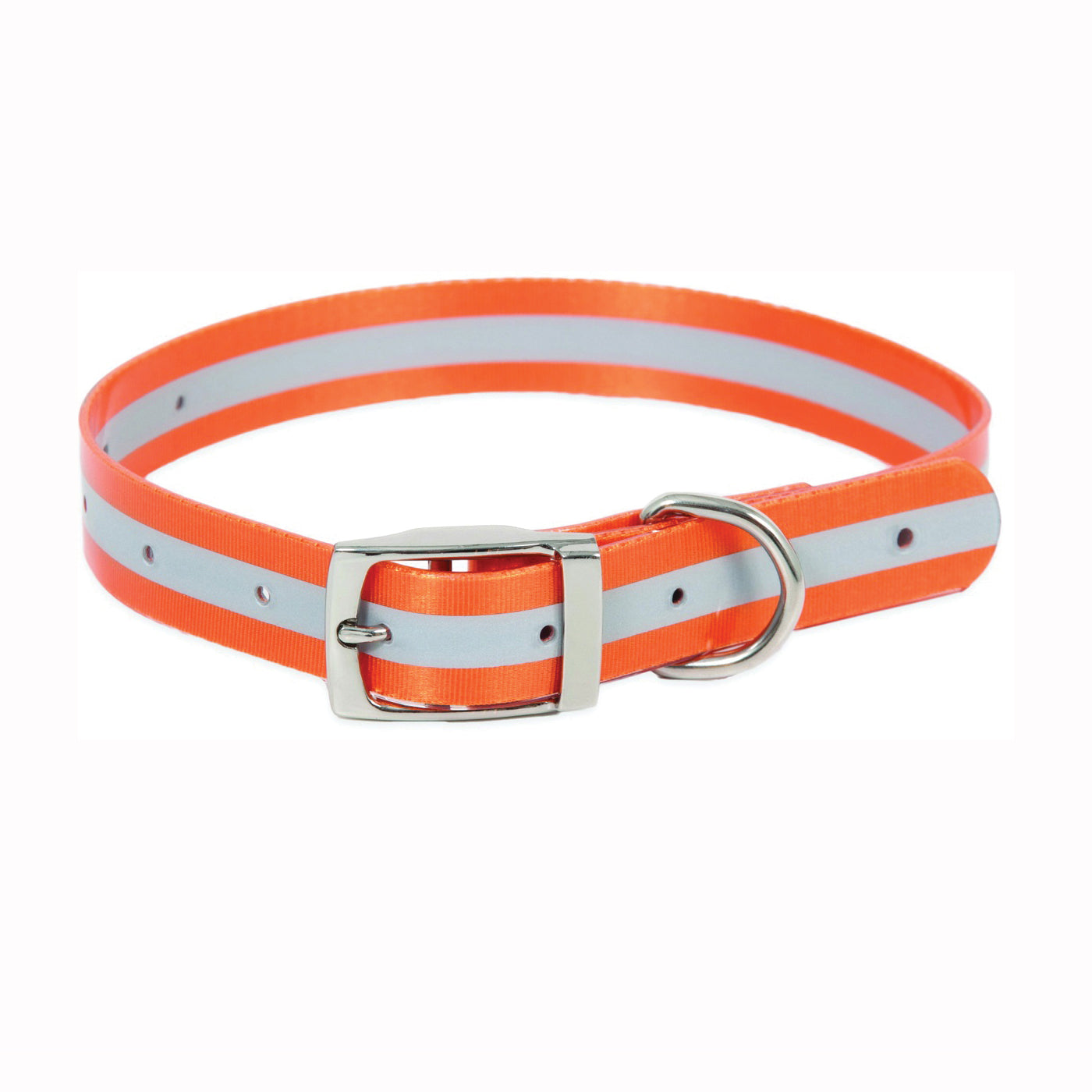 High-powered outdoor companions need dependable dog collars and leashes that will keep up with outdoor wear and tear. The Ruffmaxx™ line of products answers this need by providing outdoor sporting enthusiasts and their dogs with essentials like quick-release snap and traffic leads, center O-ring, reflective and waterproof collars. Slip leads and leather options are also included in this multifaceted outdoor line. The Ruffmaxx™ TPU-reflective flat collar features TPU to reduce odors and nylon with bright reflective detailing for visibility. This waterproof TPU-reflective flat collar has been specially designed to fit more sizes of dogs by using a unique pin keeper, which allows a longer collar for a smaller necked dog.