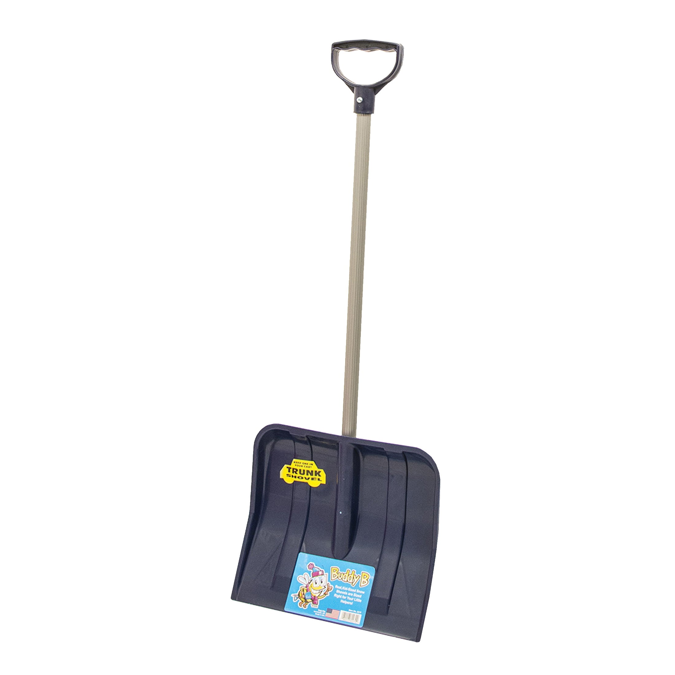 Looks like mom and dads. Overall length of 32 in. Straight vinyl covered steel handle. Poly blade size of 12 in. Molded D-grip. Non-abrasive, safe for all surfaces. Strong enough to be a trunk shovel. Made in the USA.