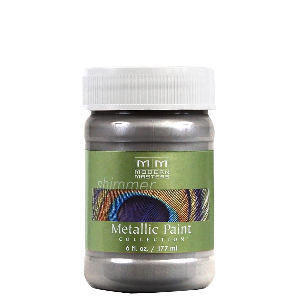 Modern Masters Metallic Paint, Net Content: 6 oz, Platinum, Sheen: Satin, Compositions: Mica, Titanium Dioxide, Aluminum Flake, Polyethylene-Polypropylene Glycol, Vinyl Acetate, Ethylene Glycol Monobutyl Ether, Specific Gravity: 1.126, Flash Point: 94 deg C, VOC Content: 97 g/L, pH Range: 5 to 10, Viscosity: 1000 to 25,000 cPs, 320 to 400 sq-ft/gal Coverage Area, Application Method: Brush, Roller, Spray, Applicable Materials: Cast Concrete, Cured Stucco, Galvanized Metal, Masonry and Brick, Unfinished Plywood, Vinyl, Drying Time: 1 hr, Boiling Point: 100 to 5537 deg C, Temperature Rating: 58 to 85 deg F, Flammability Rating: 1, Base Type: Water