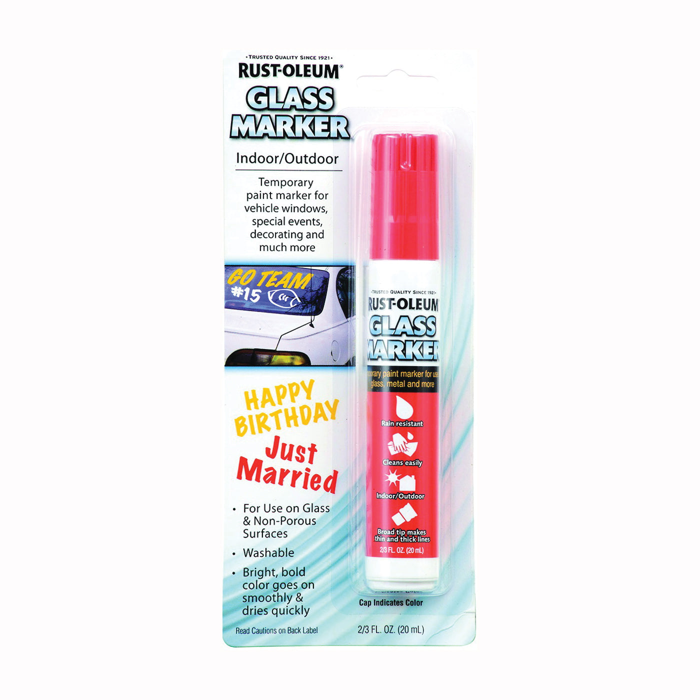 RUST-OLEUM Glass markers is a temporary paint marker for use on glass and non-porous surfaces. Large chisel tip creates thin and thick lines. Great for vehicle windows, special events, decorating and much more. Available in 6 bright colors.