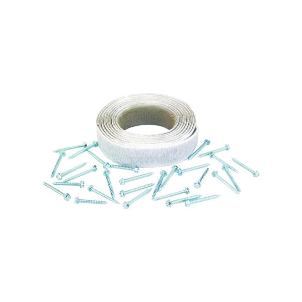 Includes one 1 in x 8 in roll of putty tape, 24 number 8 x 1 in slotted hex screws and four number 8 x 3/4 in square pan head screws. Bagged.