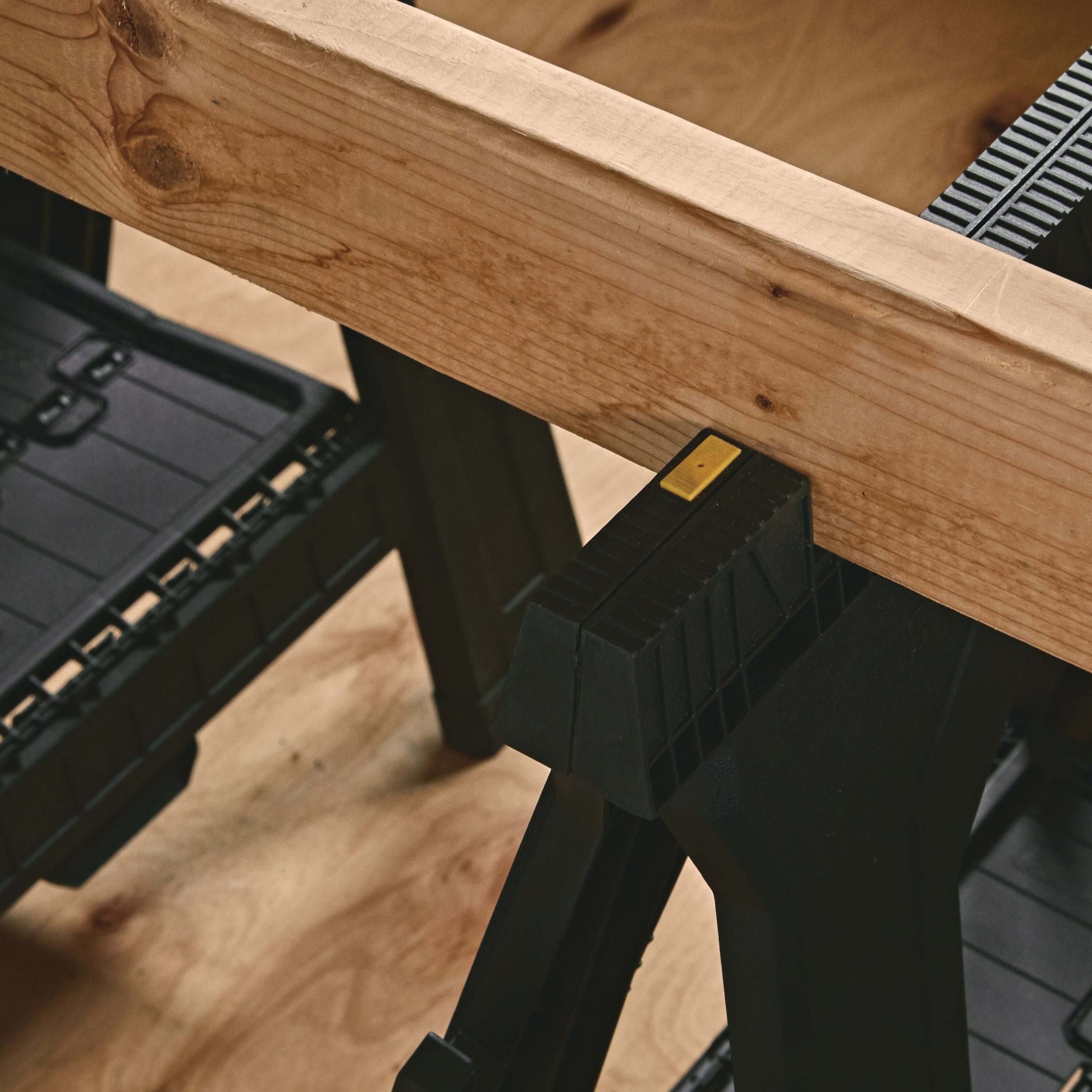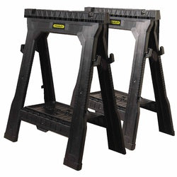 The Stanley portable folding sawhorse secures your sawing surface and is collapsible for easy transporting and storage. When used as a pair, this lightweight and sturdy sawhorse twin pack can hold 1000 lb. Built-in work holding channels keep materials securely in place and added multi-purpose side hangers allow for quick access to extension cables.